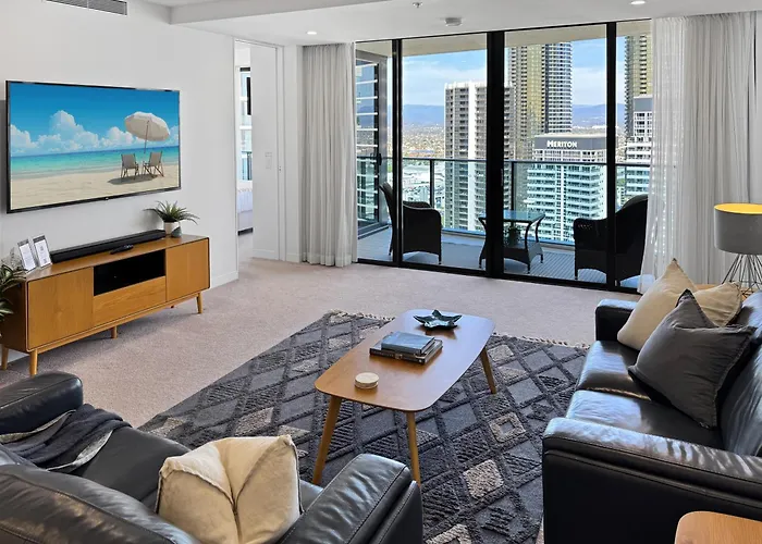 Disfruta de tus vacaciones en Gold Coast en el Apartamento Luxury Oracle Tower 1 Luxe Retreat 2Br Level 29 Gold Coast. Ideal para quienes buscan una experiencia auténtica, está situado a 10 minutos a pie del Restaurante Cabaret Drácula Gold Coast y a una distancia de 7 km del Estadio Carrara. En este apartamento de 108 m², situado a unos minutos a pie del Centro Comercial Oasis, los huéspedes pueden disfrutar de una sauna.